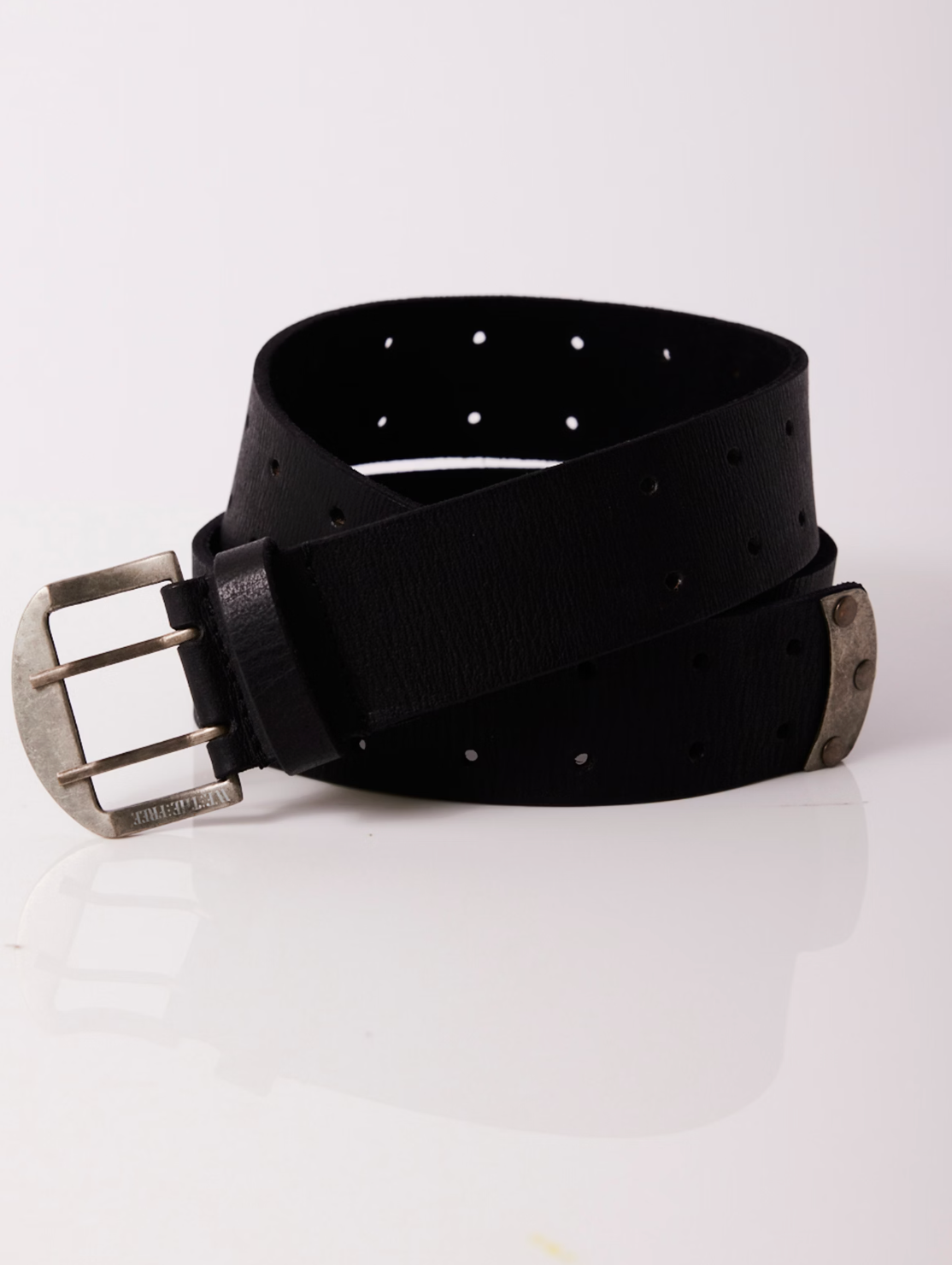 Features: Medium width, leather fabrication, metal buckle, defined holes throughout