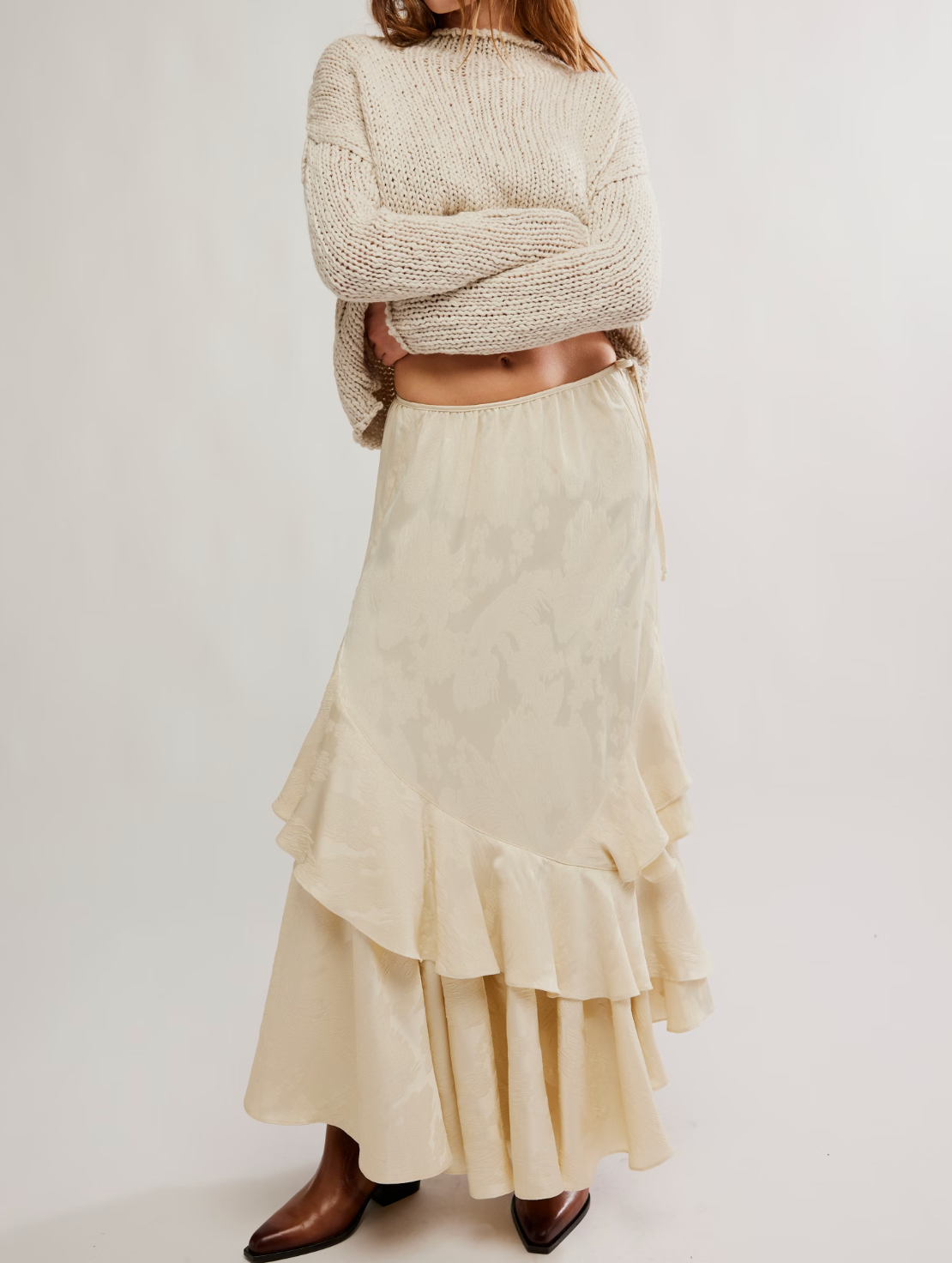 So classic and forever femme, this sweet maxi skirt features a jacquard floral design throughout with asymmetrical ruffle hemline and tie detail at the side for a timeless touch.