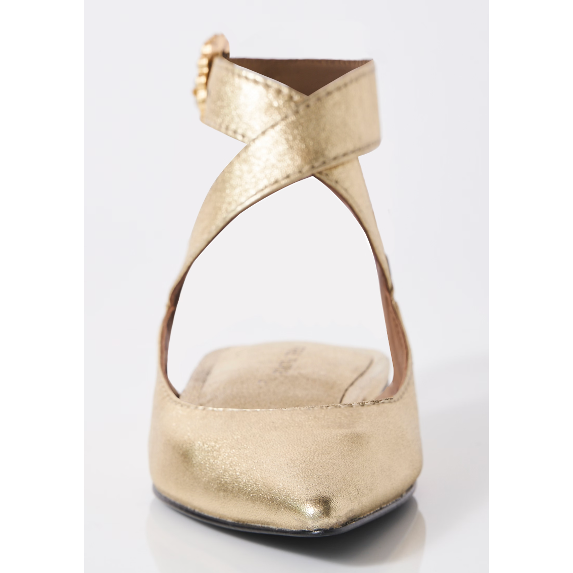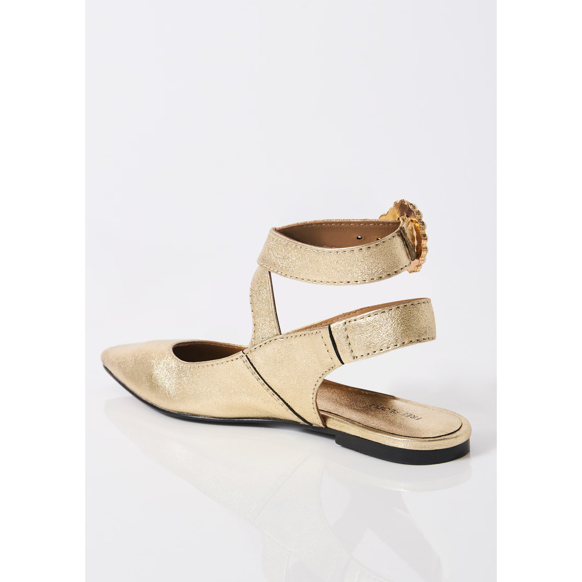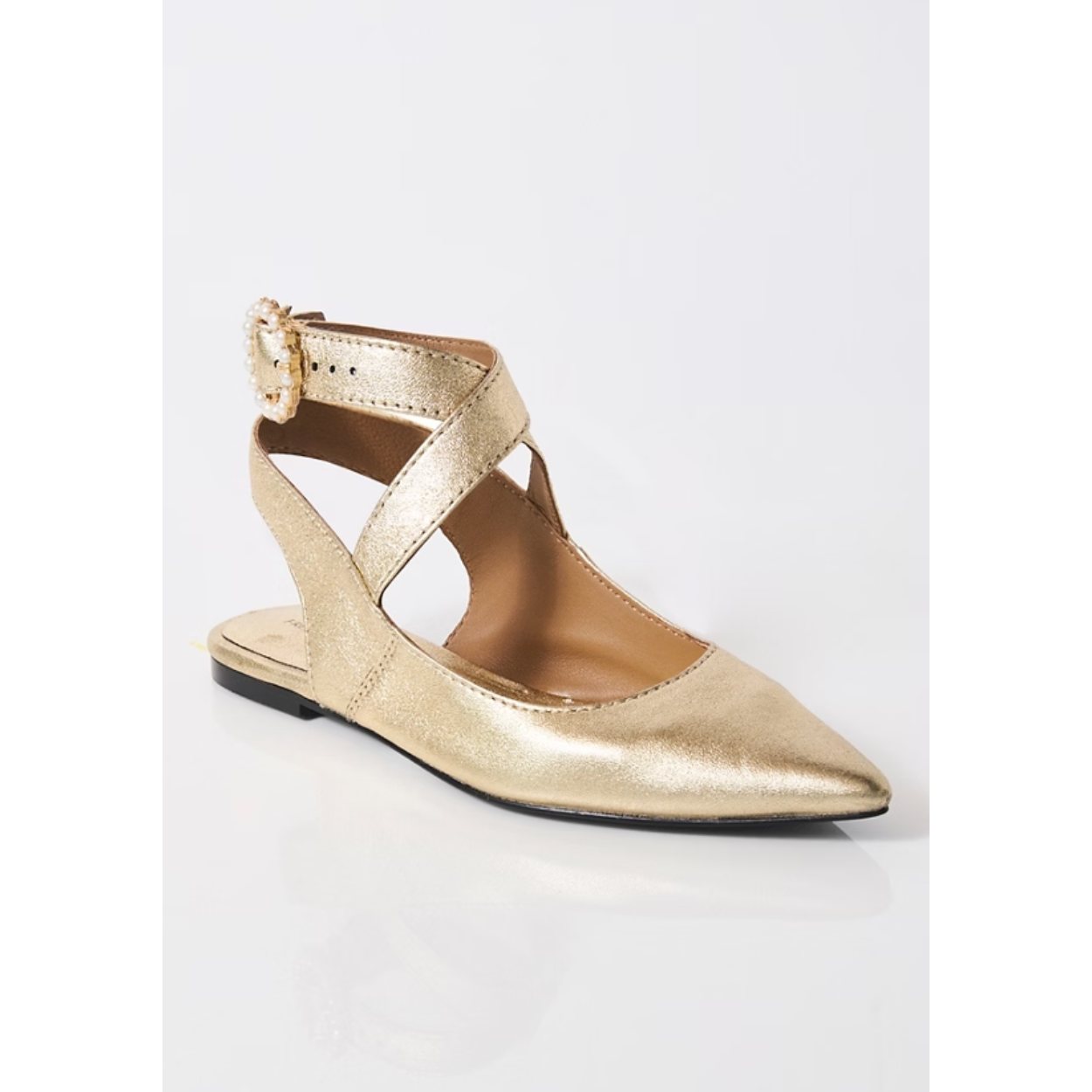 Features: Slip-on style, leather uppers, pointed toe, wrapped ankle strap with adjustable buckle, pearl accents, contrast stitching, flat sole