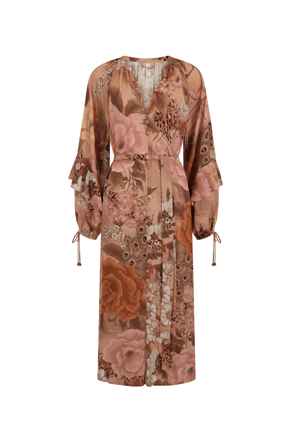 The Stealing Beauty Gown in Rose Quartz is a versatile and infinitely wearable piece. Crafted from 100% LENZING™ ECOVERO™ Viscose, this midi dress features a stunning allover print in universally flattering tones. Button it closed as a dress for any event, or leave it undone to reveal its secret life as a flowing duster. Long sleeves finished with ruffled details and playful tied cuffs add personality, while the waist tie sculpts your silhouette.