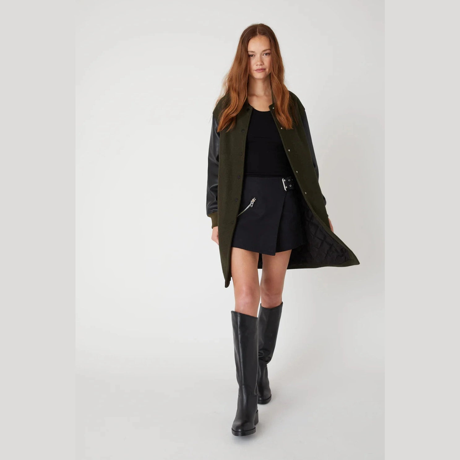 Change up your look with the BlankNYC Role Play Coat. This playful coat features a green exterior and black vegan leather sleeves, making it the perfect addition to any wardrobe.