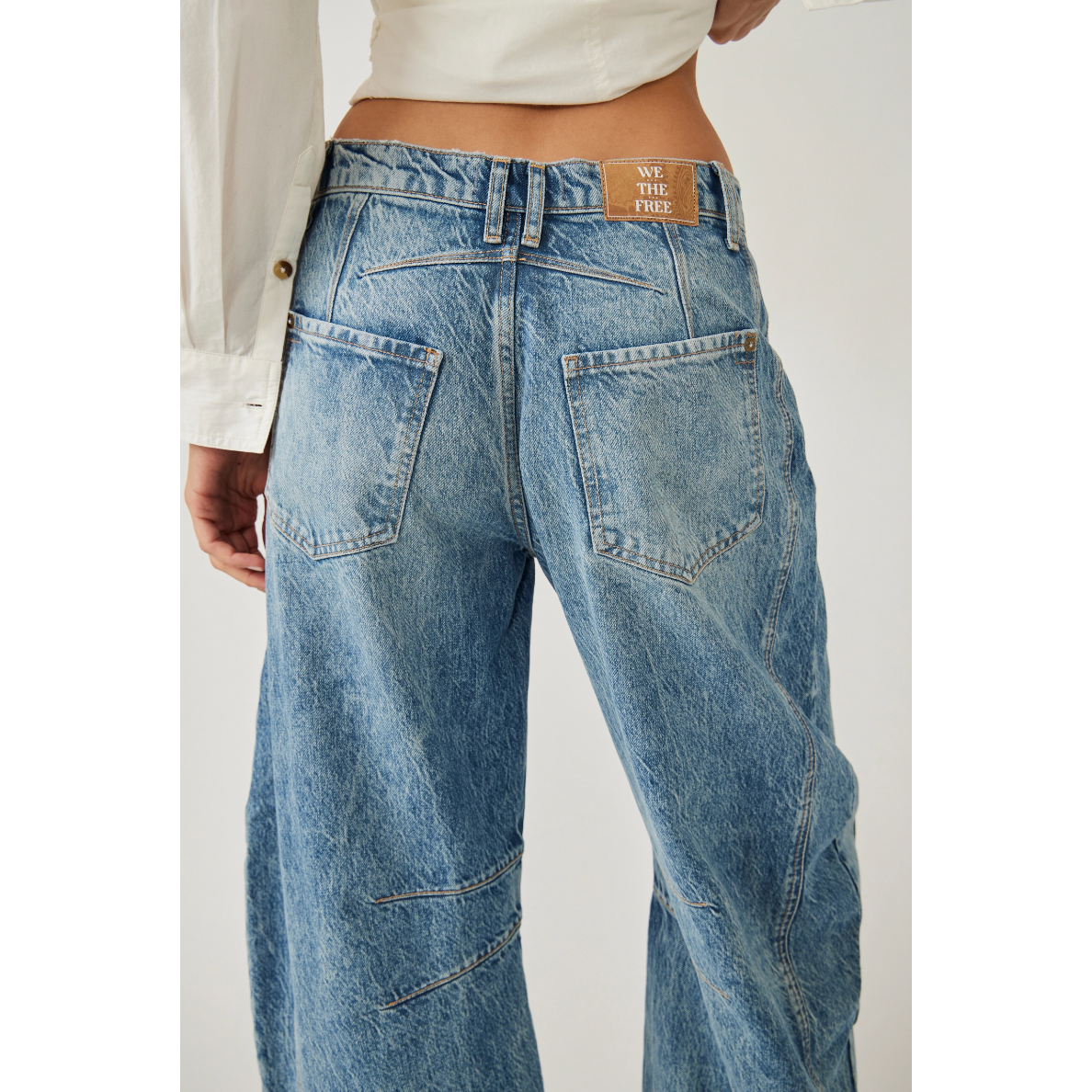 So bold barrel jeans from our We The Free collection featured in a mid-rise fit with subtle distressed detailing and wide-legs that taper at the ankle.