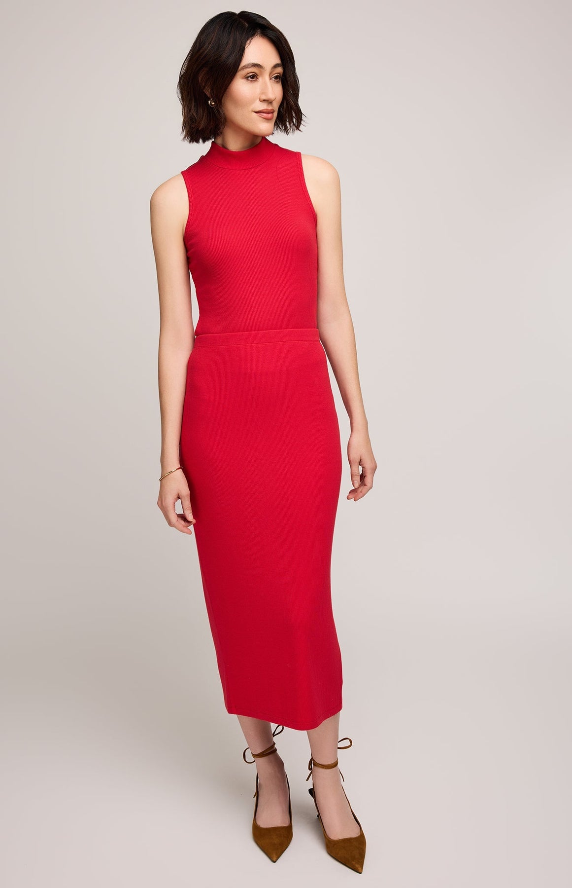The Michelle tank is made of a mid-weight cotton viscose ribbed fabric. Features include a mock neckline and slightly cropped length for easy layering. Complete the look with the Catalina skirt.